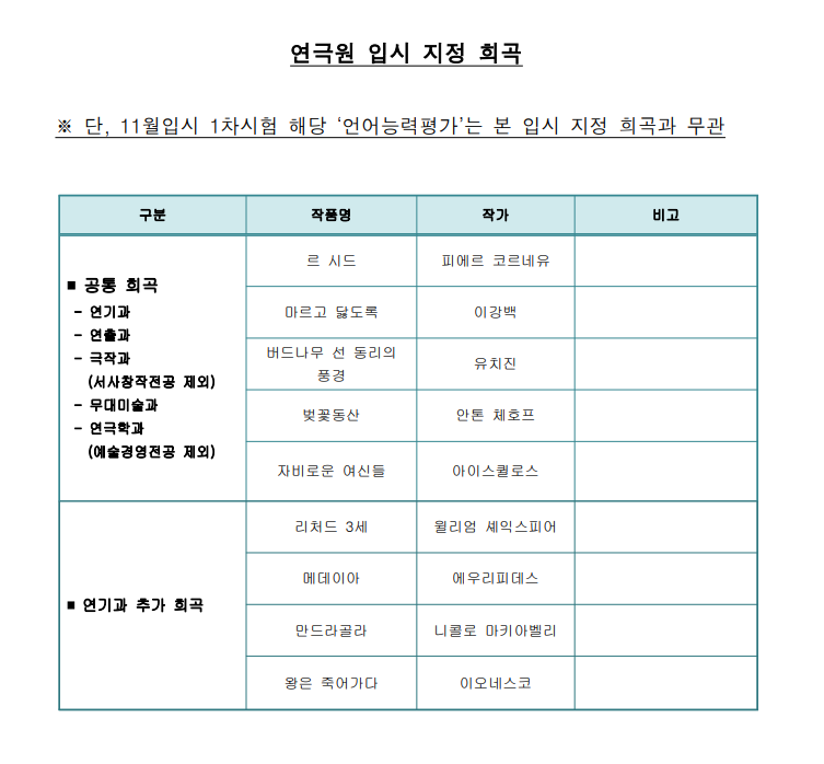 준비독백은 지정 희곡 = 연기과 추가 희곡만 해당되며 공통 희곡은 제외함. 1차 때와 다른 독백 준비
