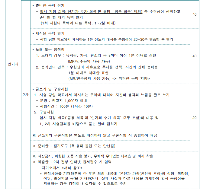 -구술시험: 입시 지정 희곡(공통희곡과 추가 희곡 모두 포함)의 내용과 1,2차 시험결과를 바탕으로 질의응답
