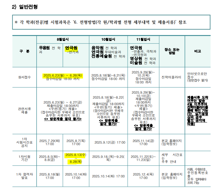 2026 한국예술종합학교 연기과 수시 전형 입시요강 본문